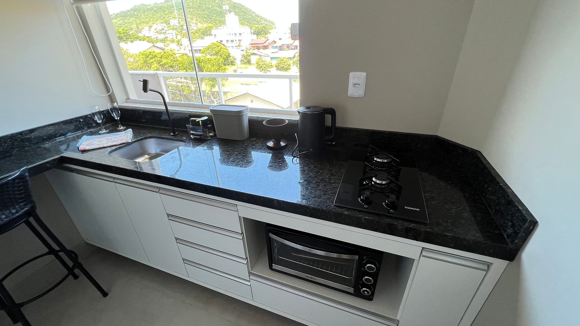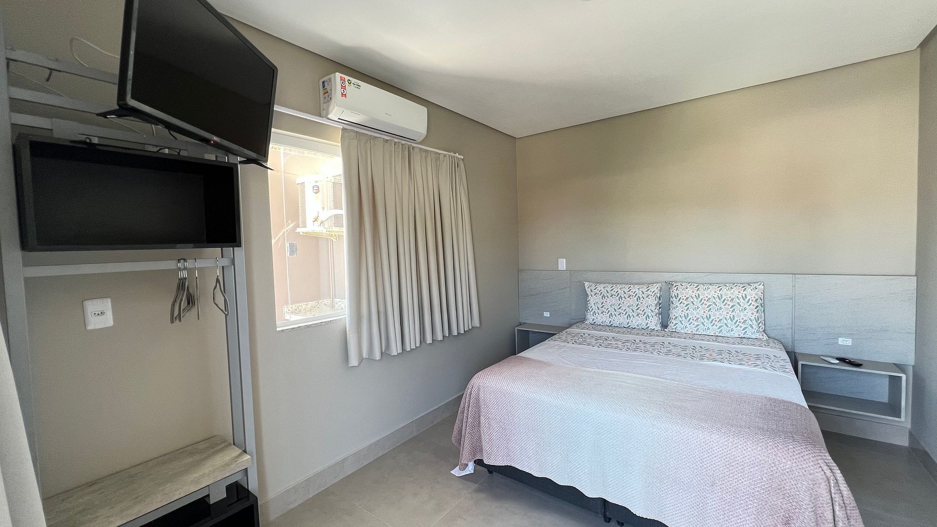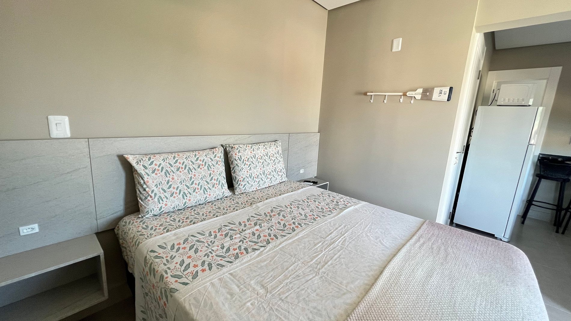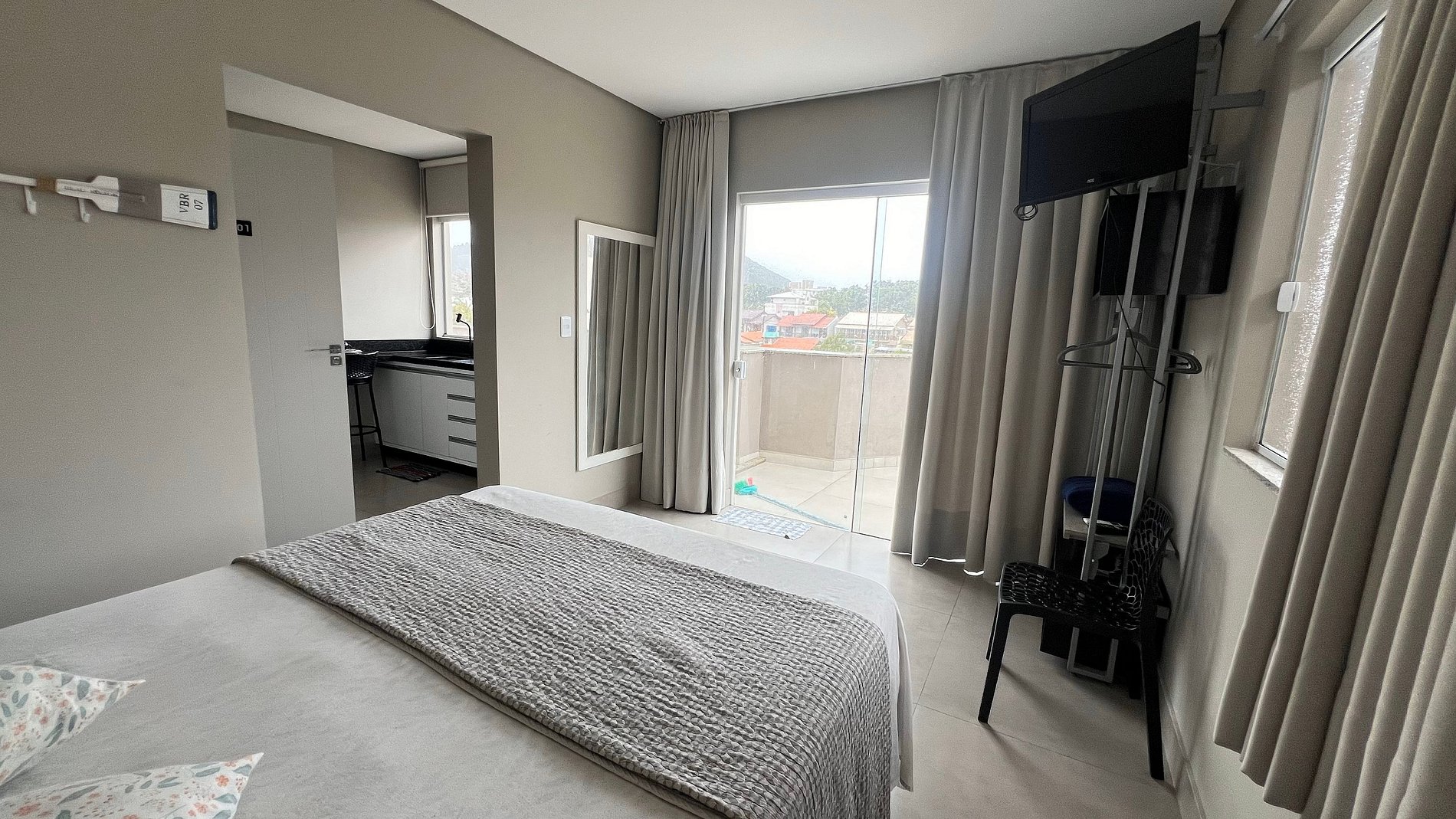 Apartamento para casal. A partir da porta de entrada, temos uma e cozinha, para direita, acessamos um dormitório com cama queen size e TV 32", a esquerda o acesso ao banheiro. Na saída do quarto para sacada, à direita, encontramos uma churrasqueira com uma pia/tanque. Por ser um apartamento com um só ambiente (exceto banheiro), um ar-condicionado atende a todo o apartamento.