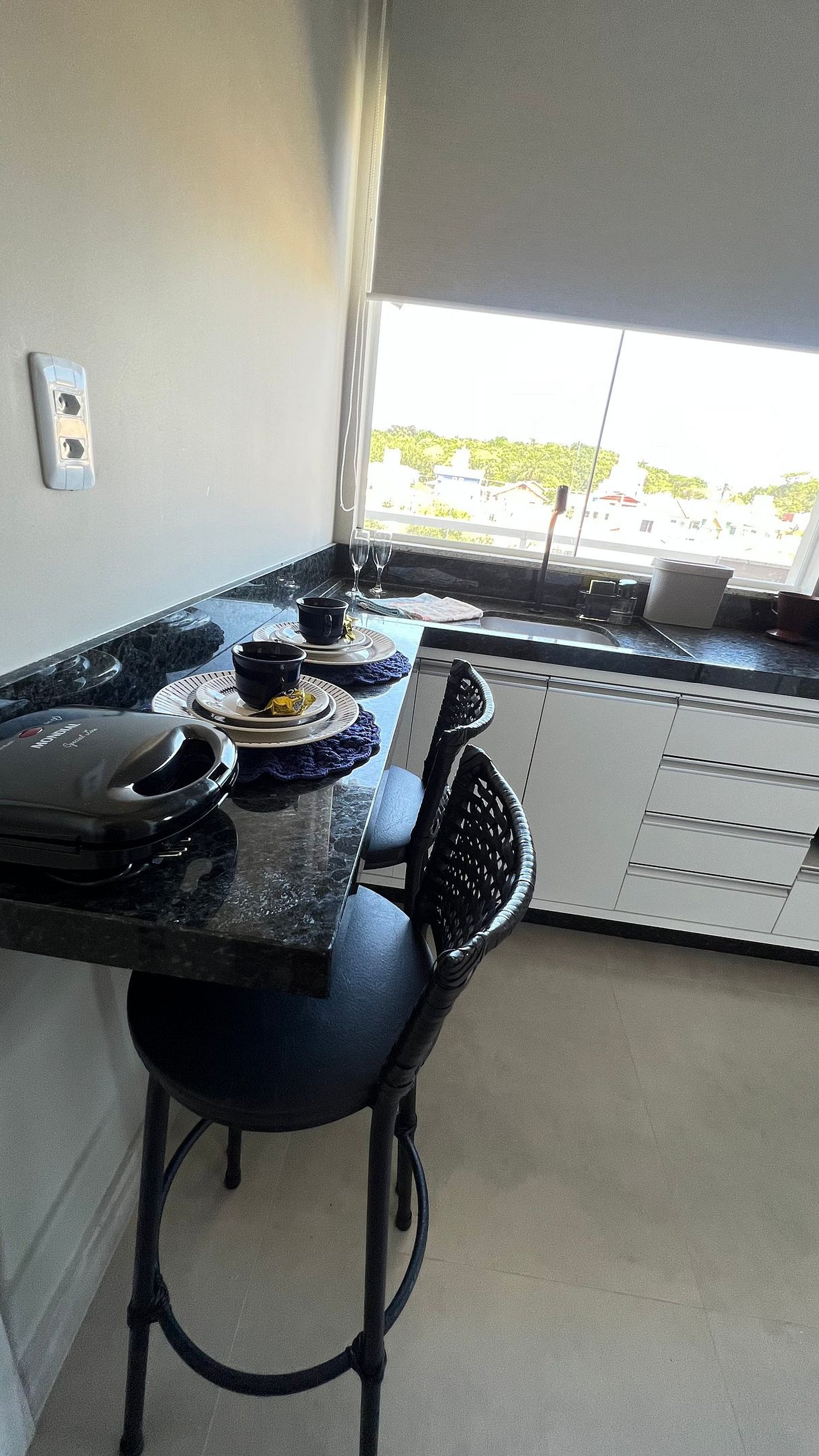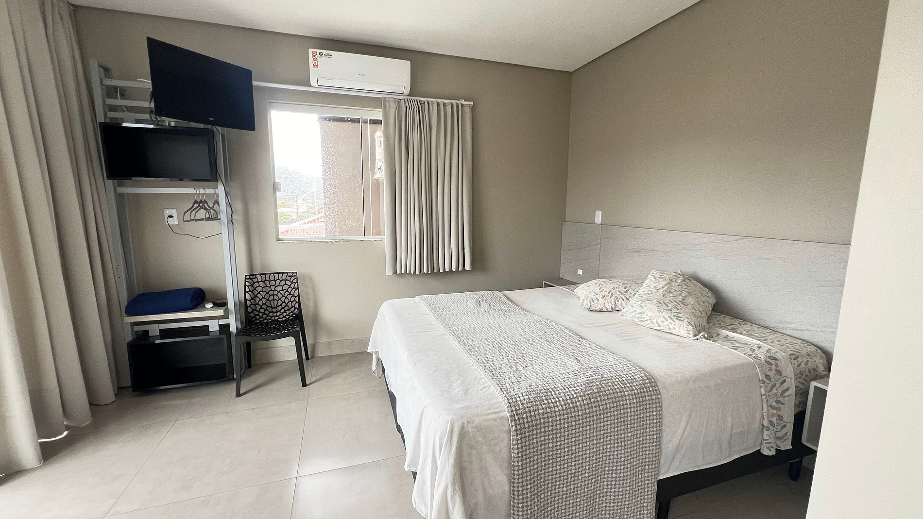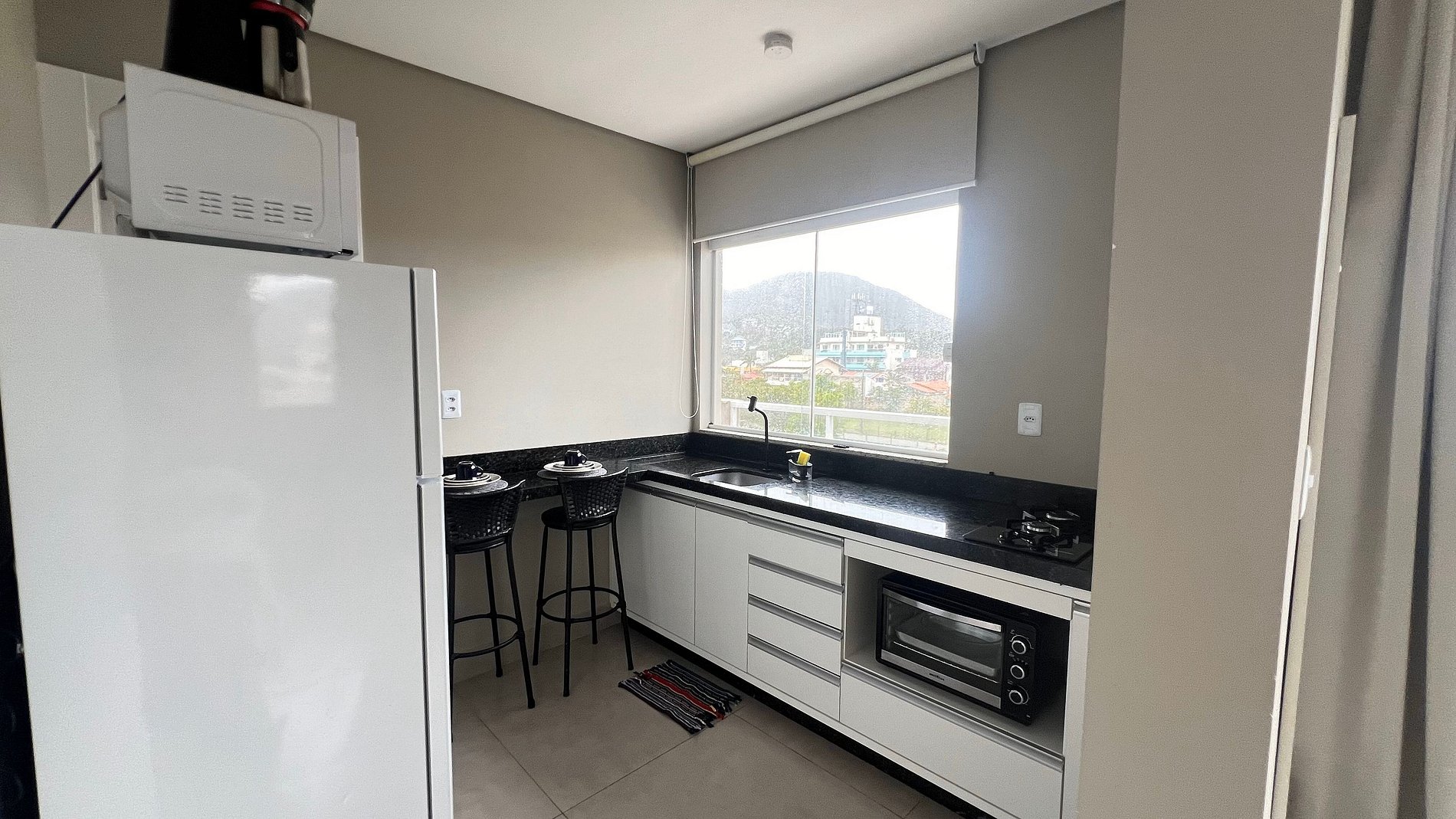 Apartamento para casal. A partir da porta de entrada, temos uma e cozinha, para direita, acessamos um dormitório com cama queen size e TV 32", a esquerda o acesso ao banheiro. Na saída do quarto para sacada, à direita, encontramos uma churrasqueira com uma pia/tanque. Por ser um apartamento com um só ambiente (exceto banheiro), um ar-condicionado atende a todo o apartamento.
