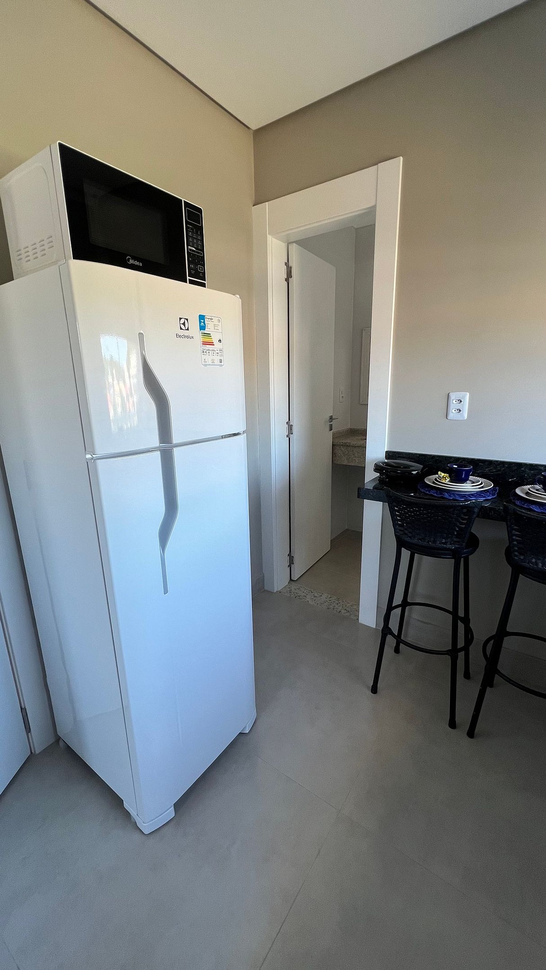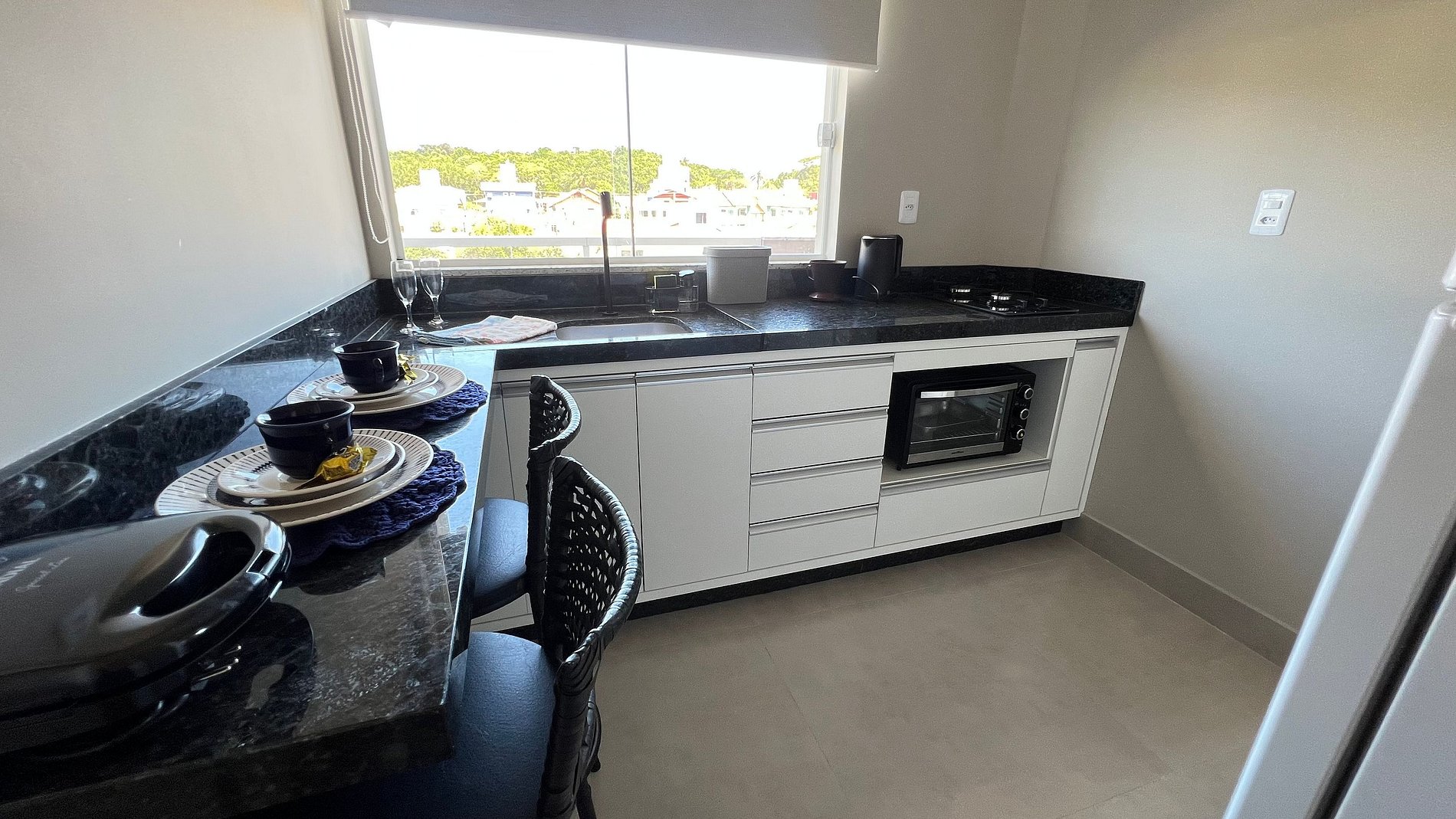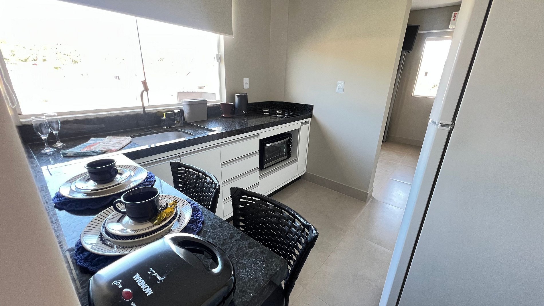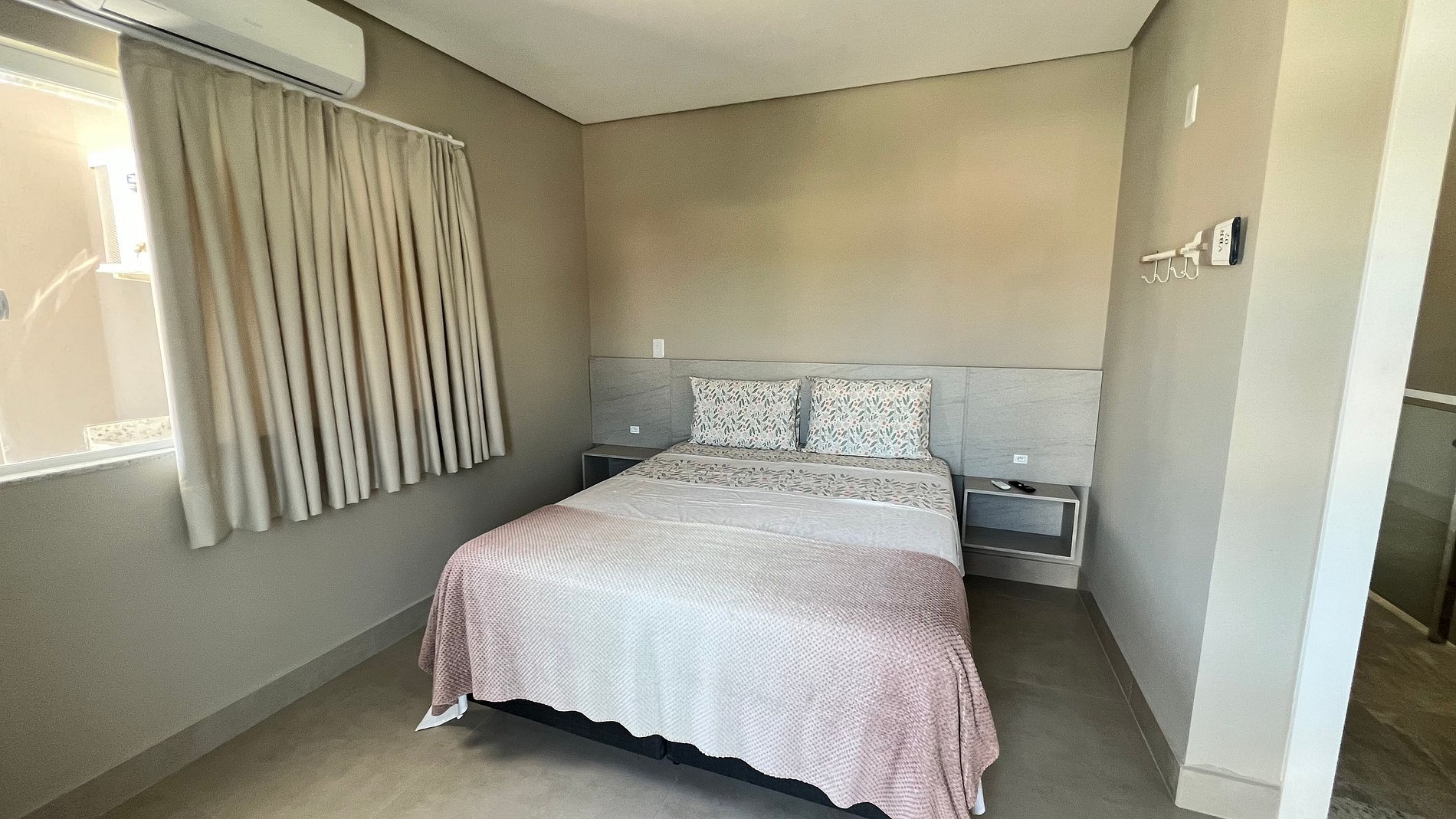 Apartamento para casal. A partir da porta de entrada, temos uma e cozinha, para direita, acessamos um dormitório com cama queen size e TV 32", a esquerda o acesso ao banheiro. Na saída do quarto para sacada, à direita, encontramos uma churrasqueira com uma pia/tanque. Por ser um apartamento com um só ambiente (exceto banheiro), um ar-condicionado atende a todo o apartamento.