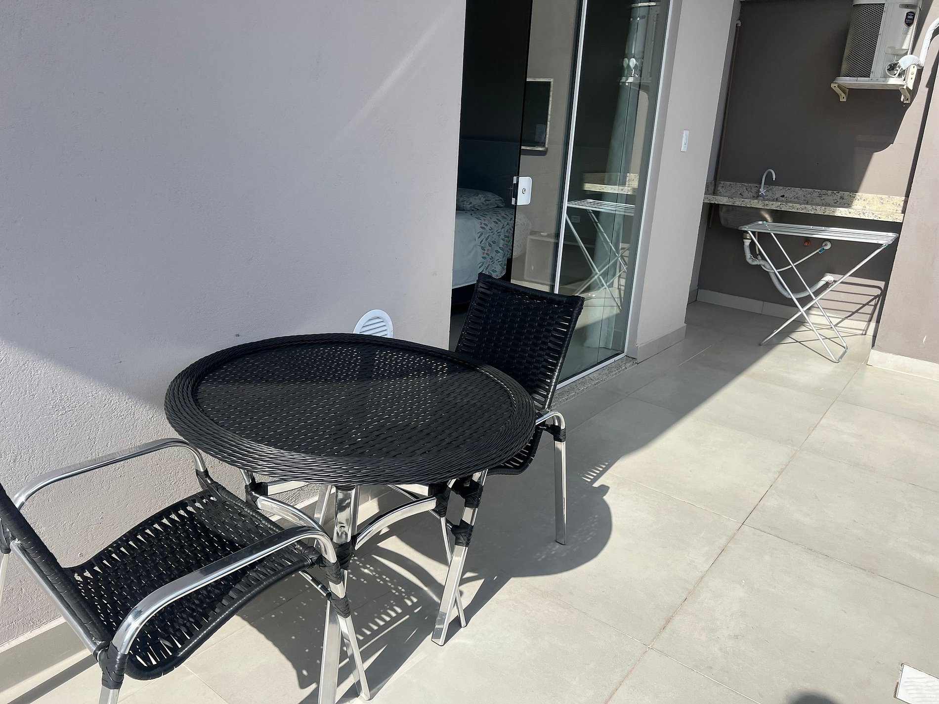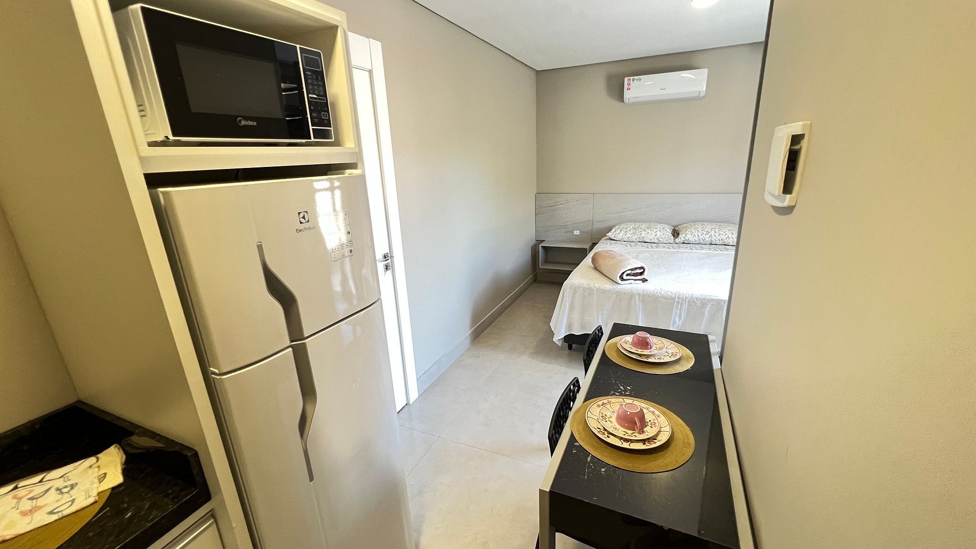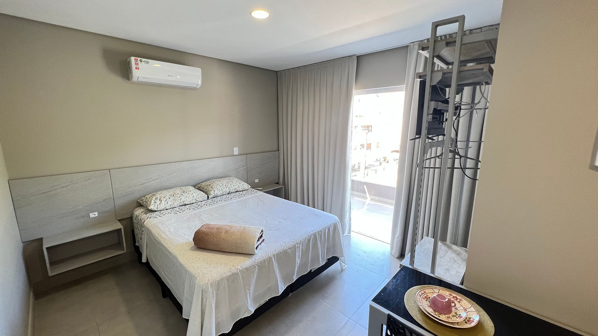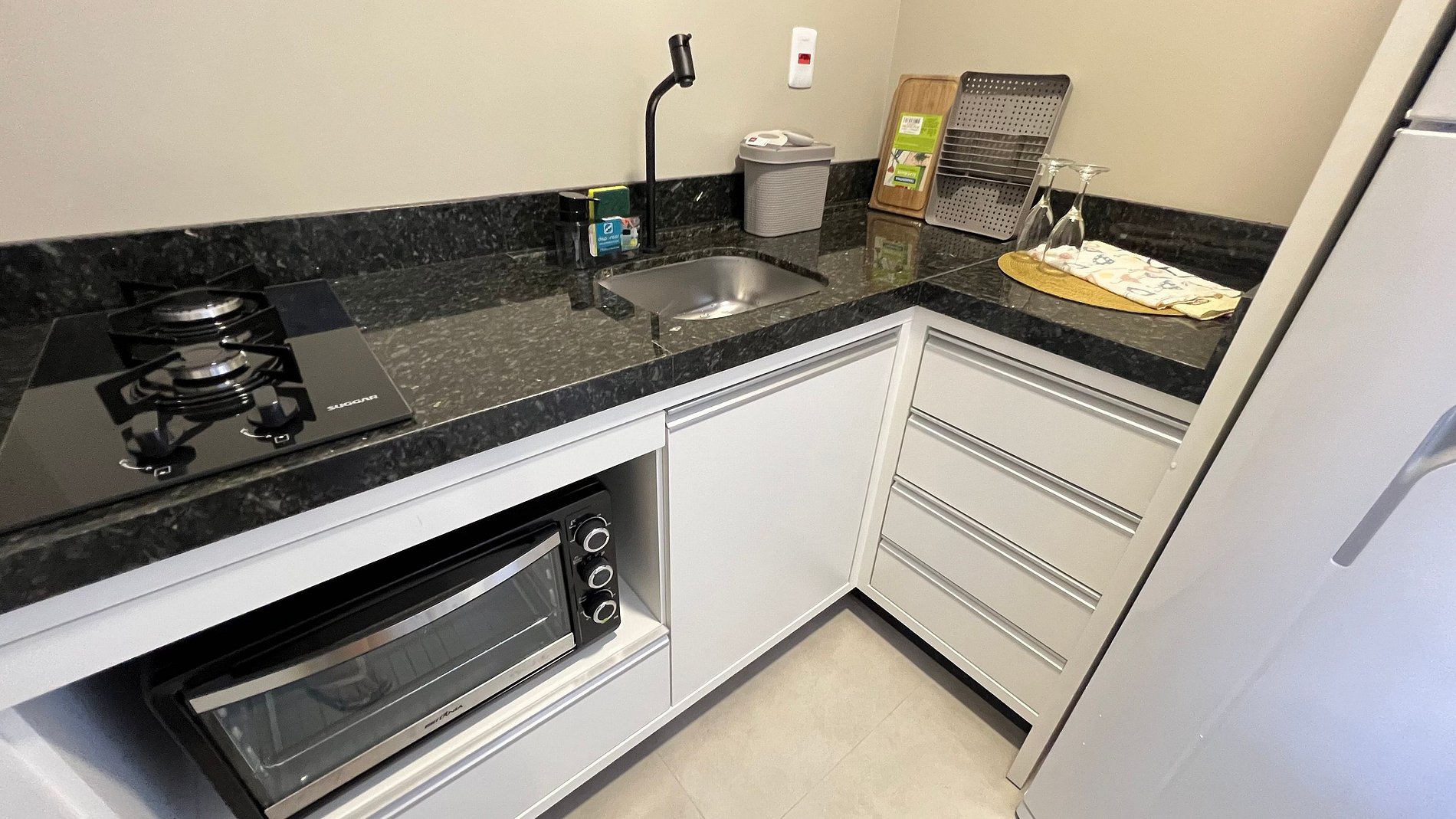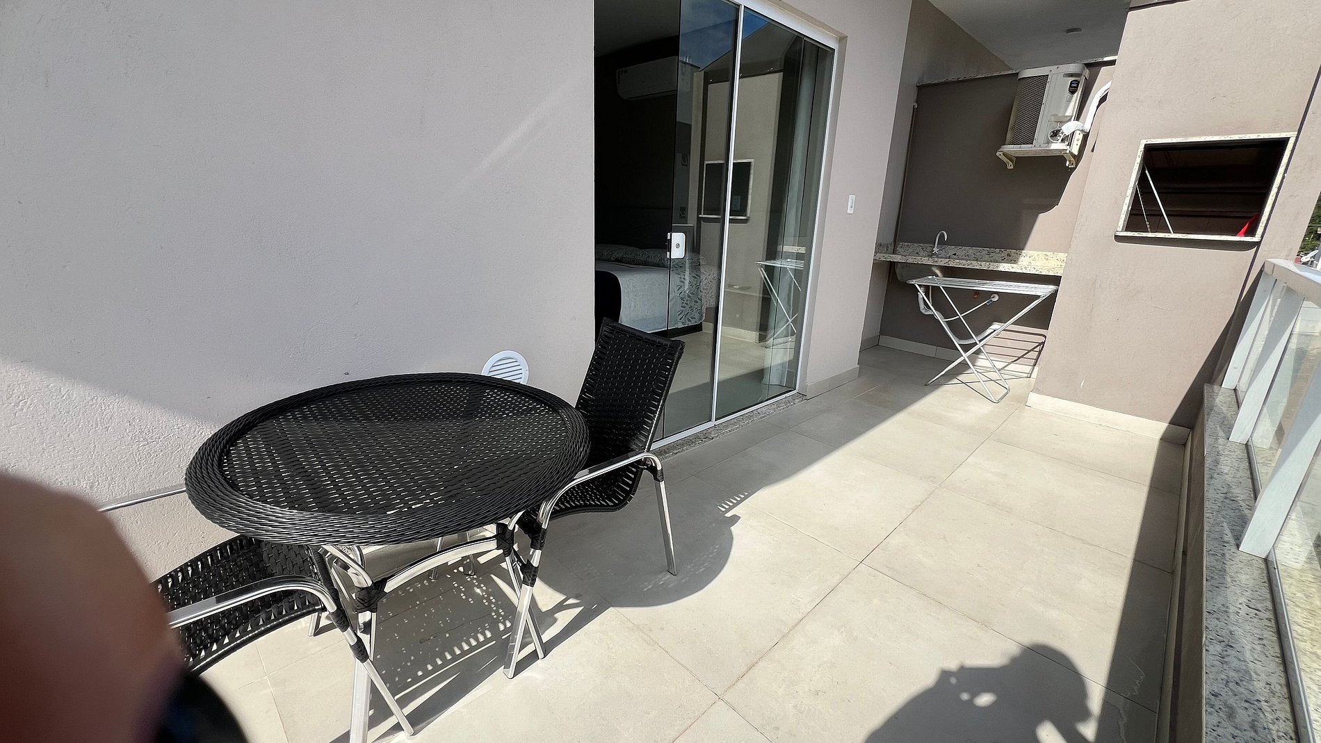 Apartamento para casal. A partir da porta de entrada, temos uma e cozinha a direita, e um dormitório com cama queen size e TV 32", a esquerda o acesso ao banheiro. Na saída do quarto para sacada, à esquerda, encontramos uma churrasqueira com uma pia/tanque. Por ser um apartamento com um só ambiente (exceto banheiro), um ar-condicionado atende a todo o apartamento.
