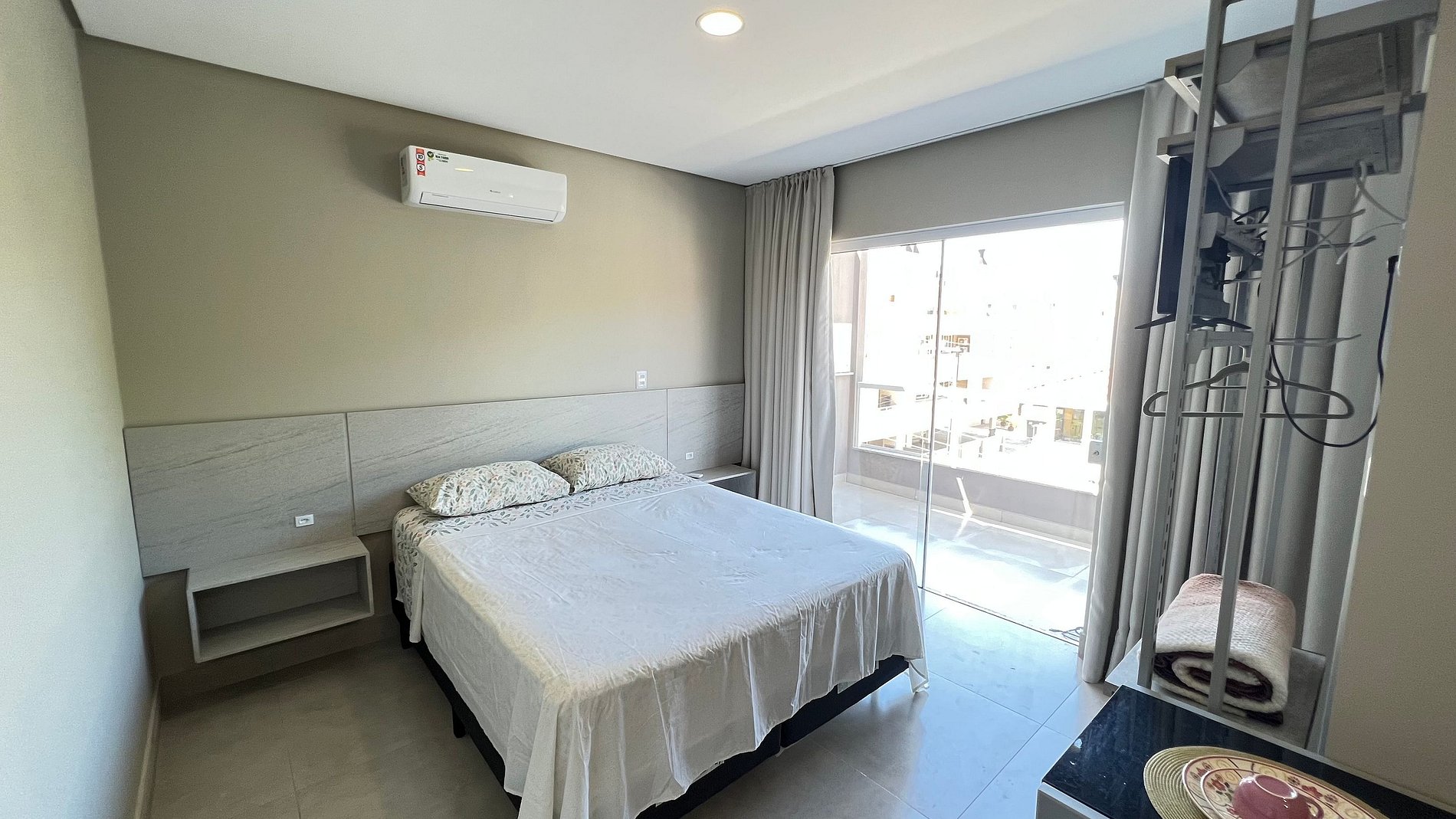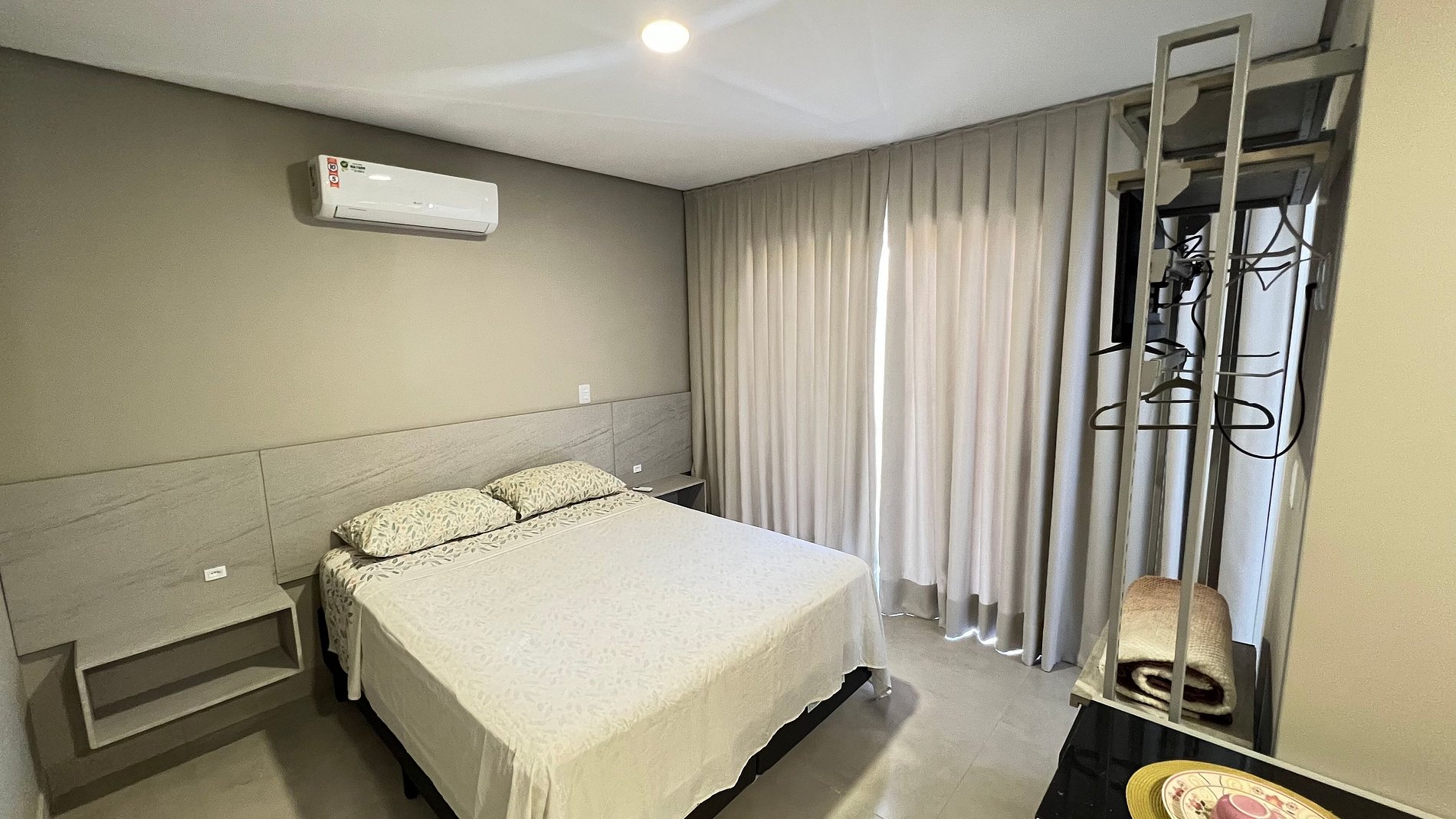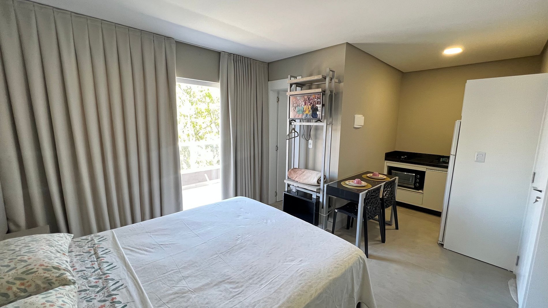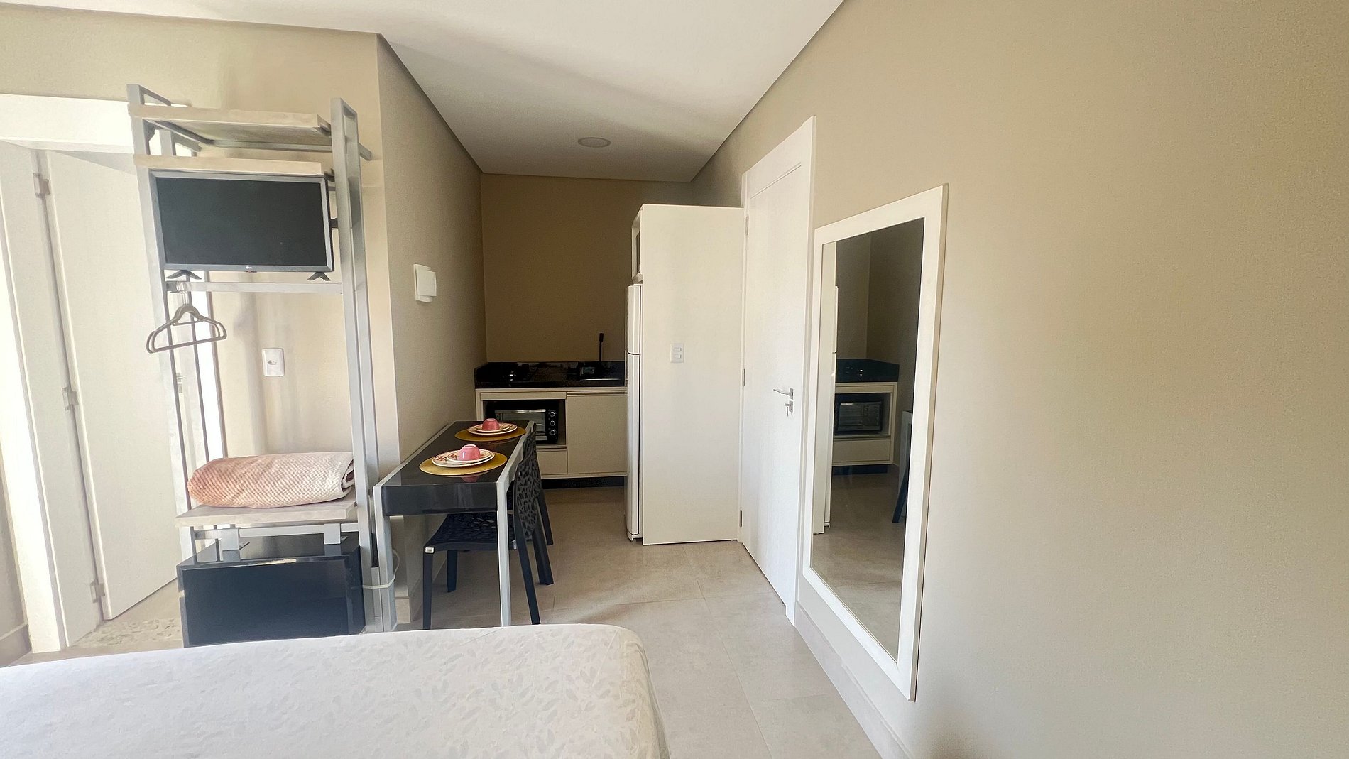Apartamento para casal. A partir da porta de entrada, temos uma e cozinha a direita, e um dormitório com cama queen size e TV 32", a esquerda o acesso ao banheiro. Na saída do quarto para sacada, à esquerda, encontramos uma churrasqueira com uma pia/tanque. Por ser um apartamento com um só ambiente (exceto banheiro), um ar-condicionado atende a todo o apartamento.