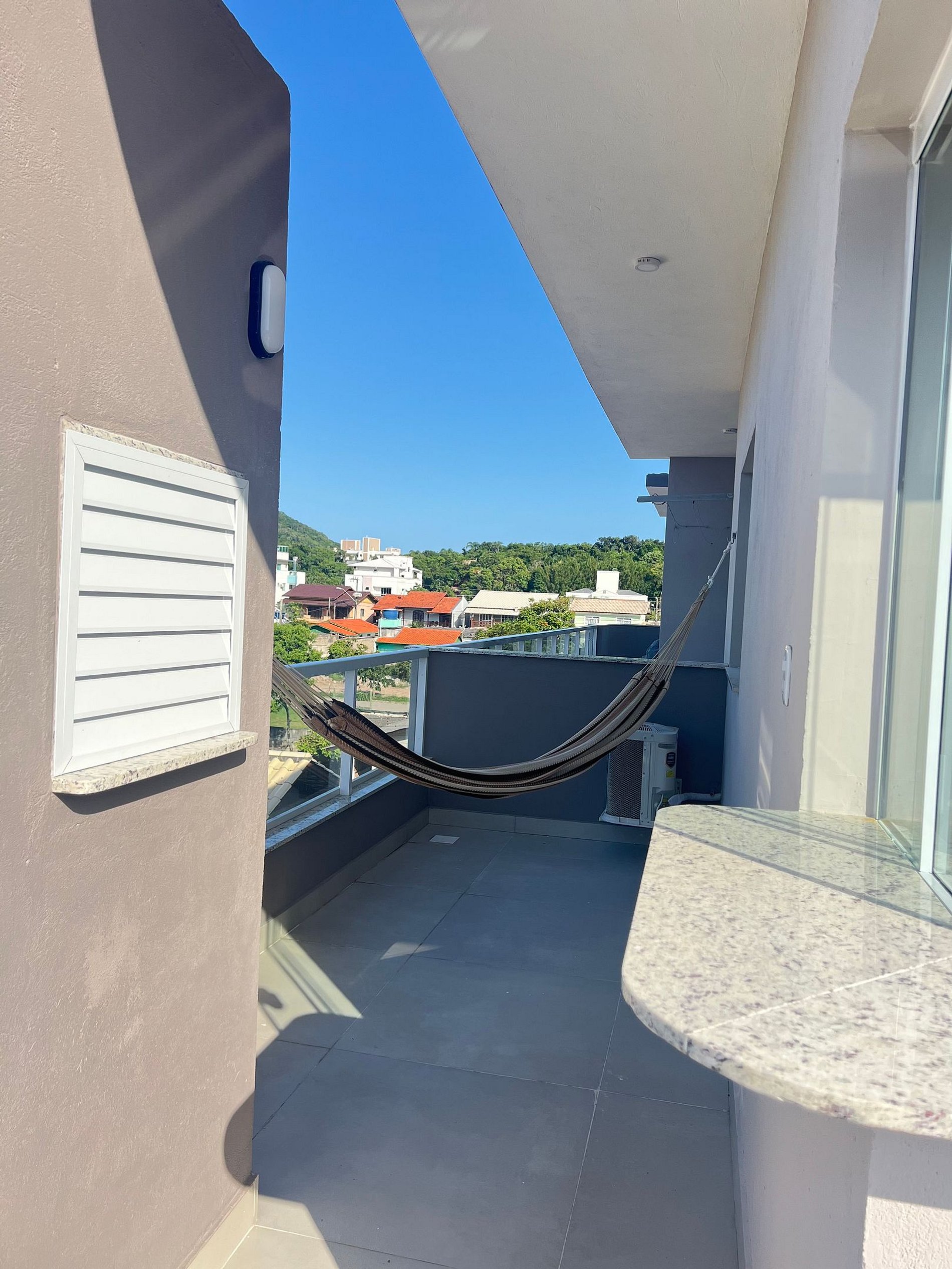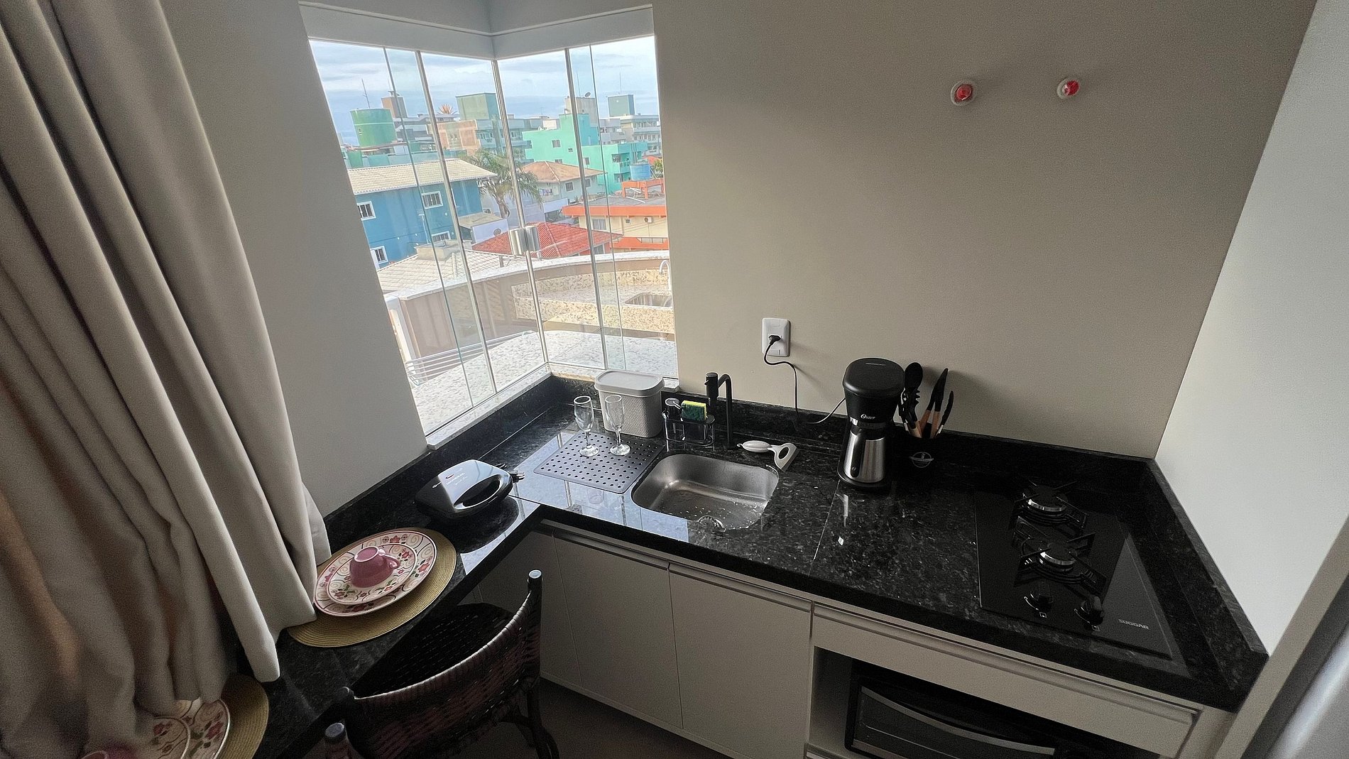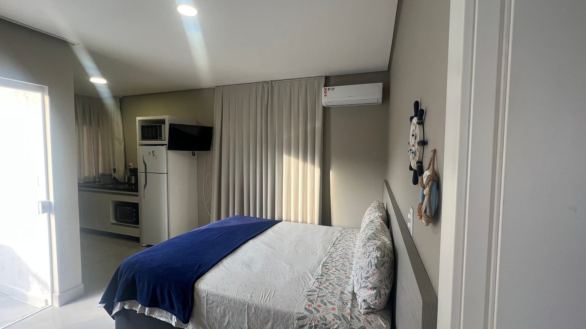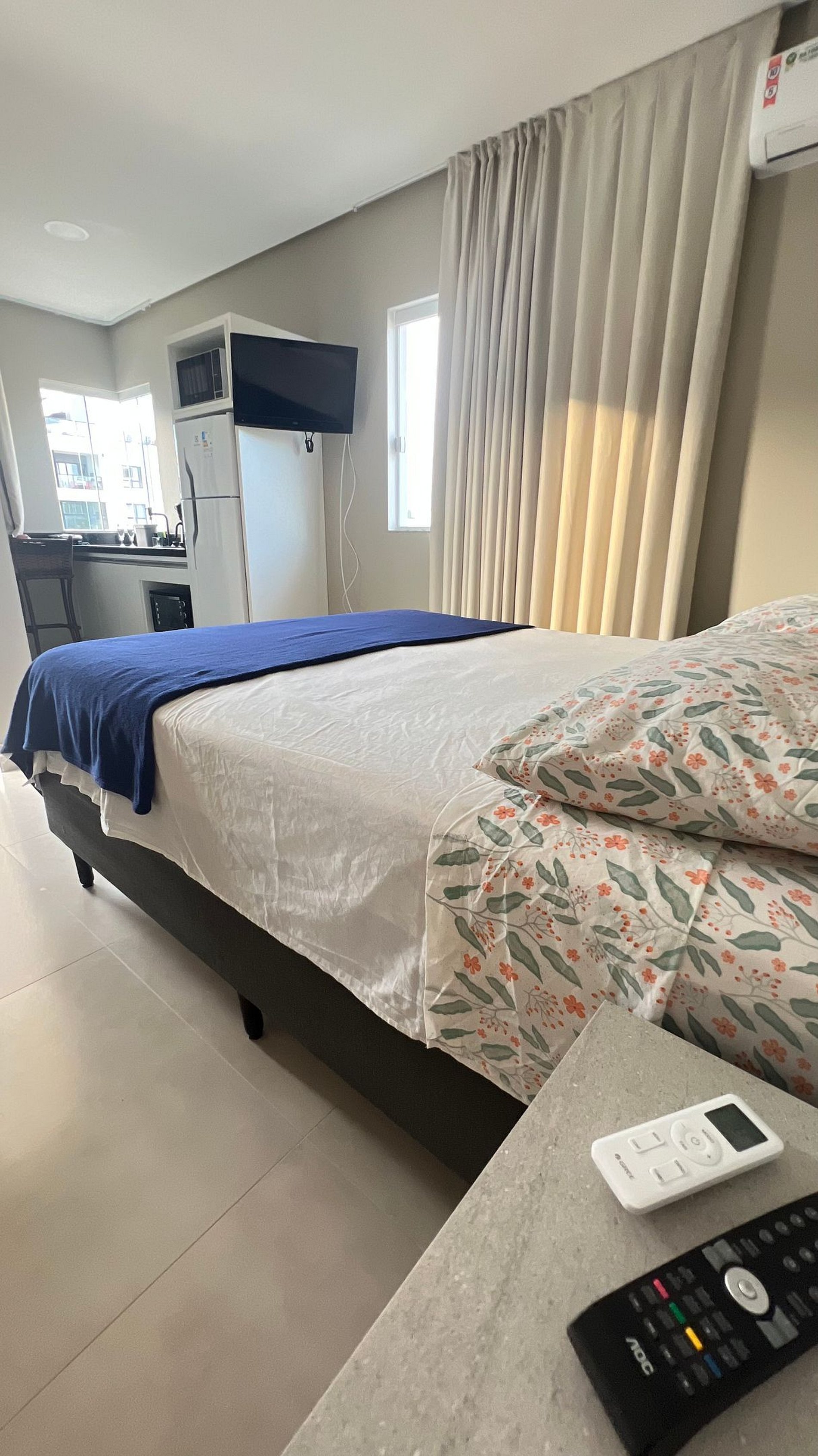 Apartamento para casal. A partir da porta de entrada, temos um dormitório com cama queen size e TV 32, uma cozinha a direita, e a esquerda o acesso ao banheiro. Na saída do quarto para sacada, à direita, encontramos uma churrasqueira com uma pia/tanque. Por ser um apartamento com um só ambiente (exceto banheiro), um ar-condicionado atende a todo o apartamento.