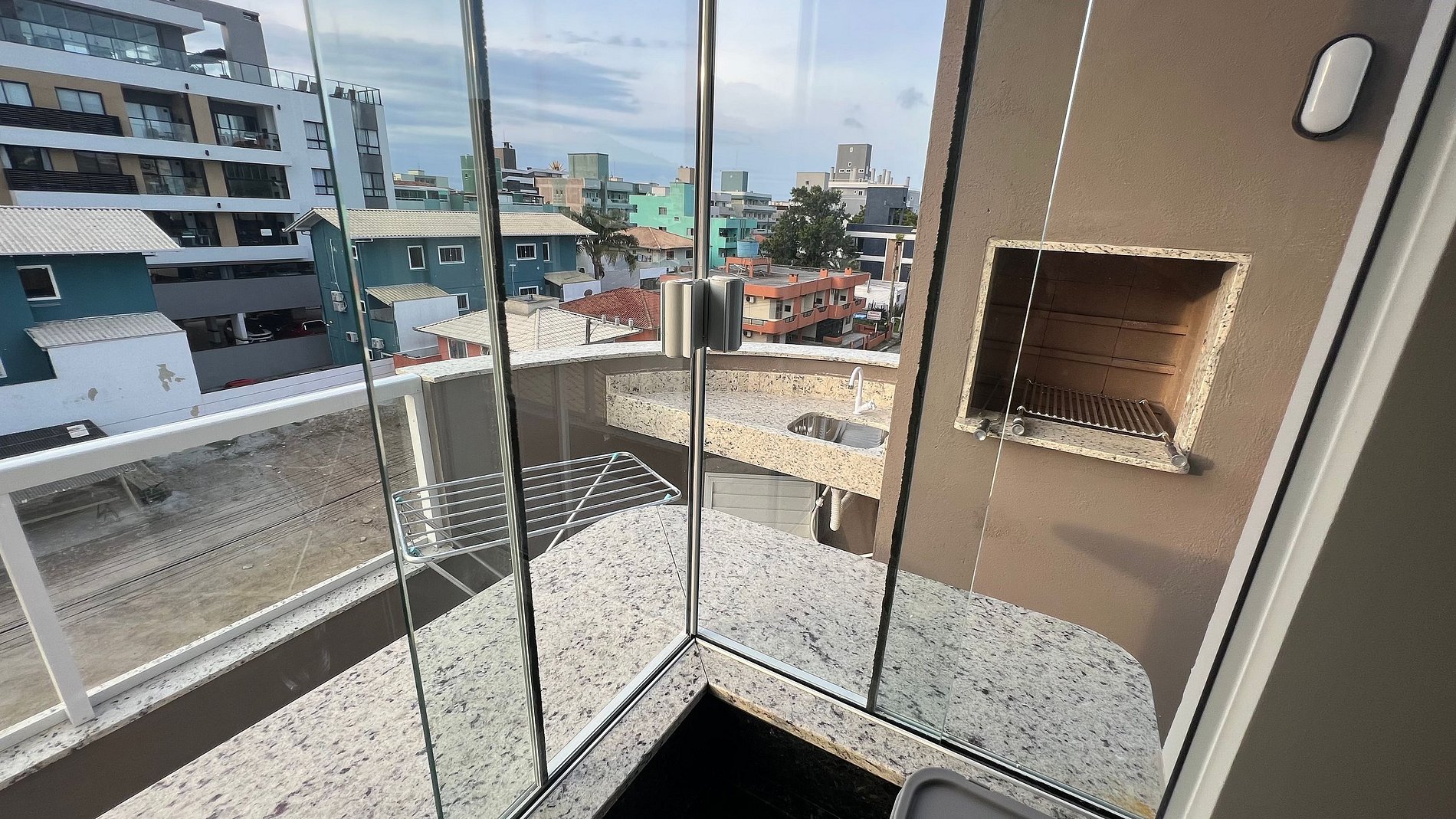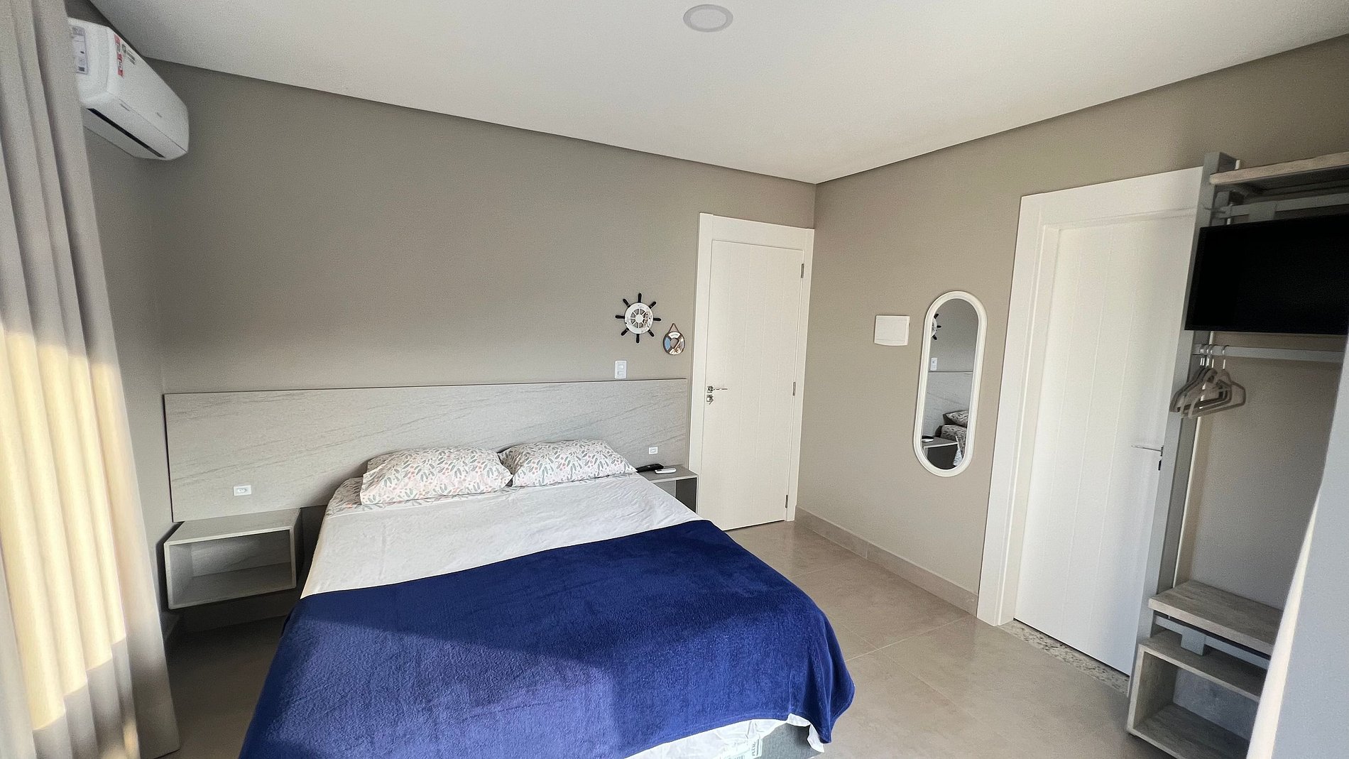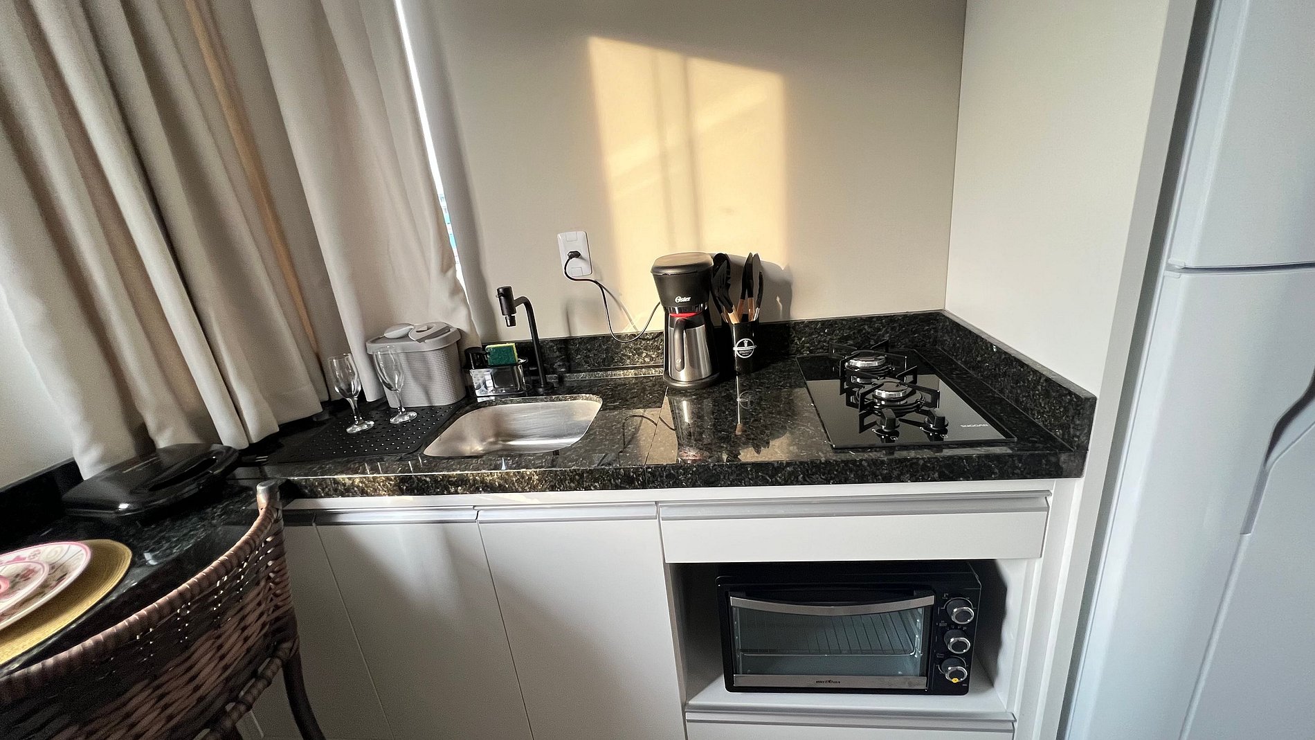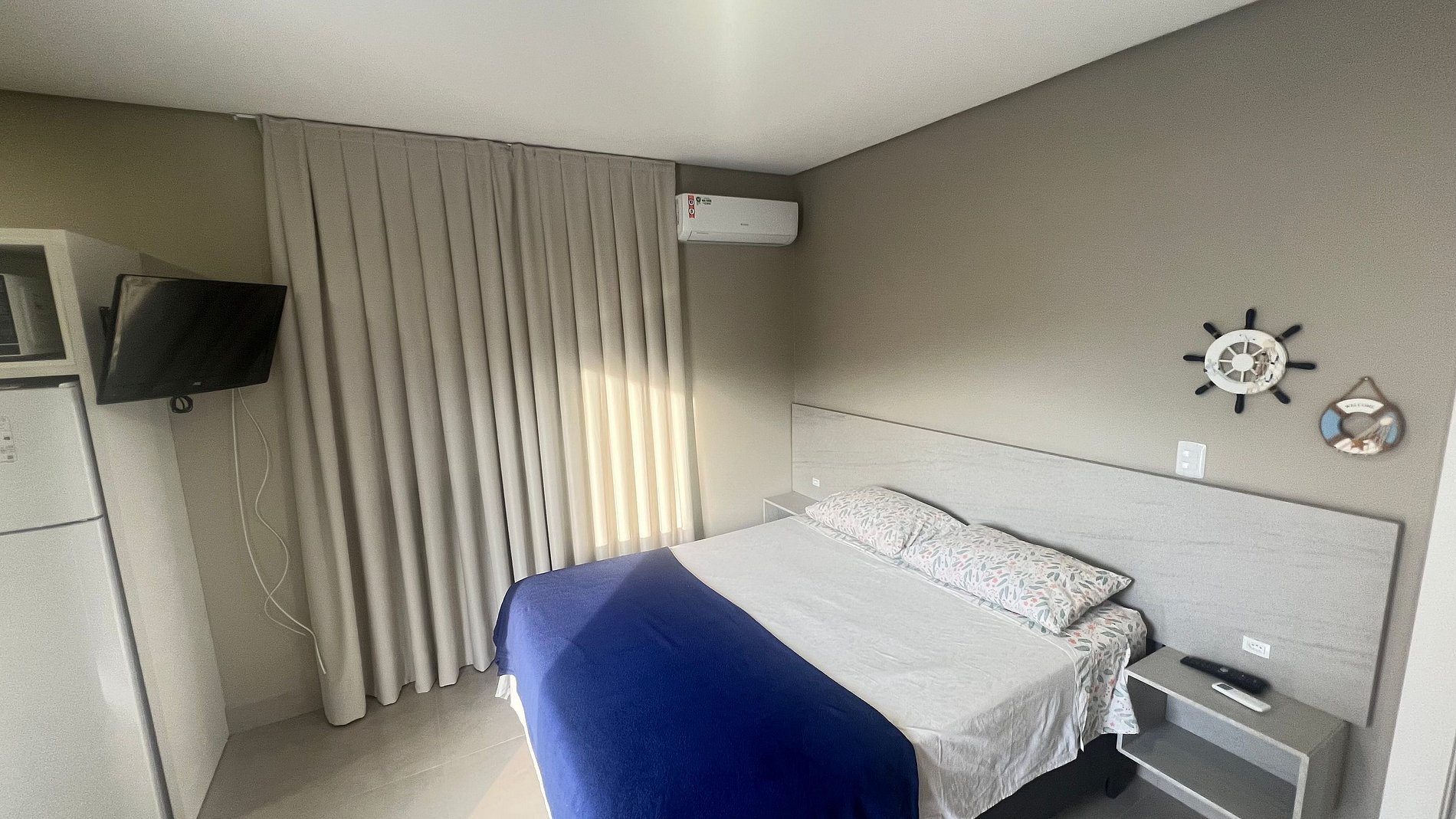 Apartamento para casal. A partir da porta de entrada, temos um dormitório com cama queen size e TV 32, uma cozinha a direita, e a esquerda o acesso ao banheiro. Na saída do quarto para sacada, à direita, encontramos uma churrasqueira com uma pia/tanque. Por ser um apartamento com um só ambiente (exceto banheiro), um ar-condicionado atende a todo o apartamento.