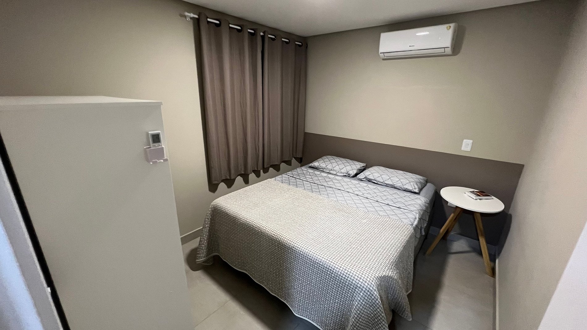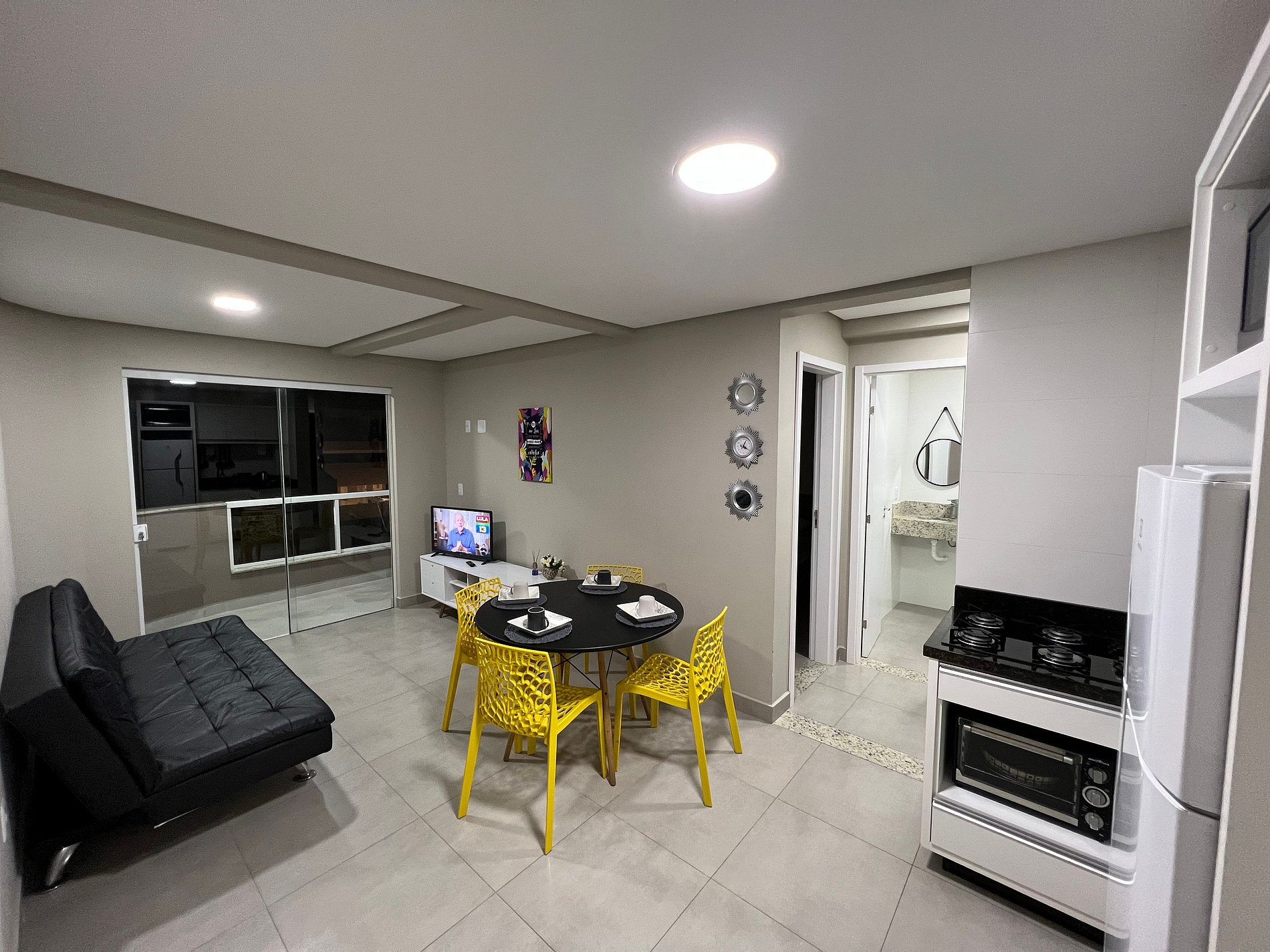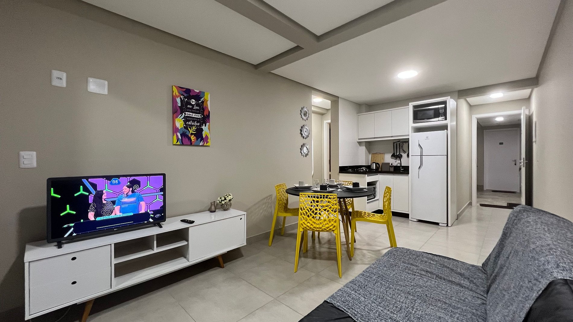 Apartamento ideal para 4 pessoas. A partir da porta de entrada para frente, temos a sala com um sofá-cama e Smart-TV 32" que, é conjugada com a cozinha formando um bom espaço para acomodar a todos, em seguida uma sacada com churrasqueira. A partir da cozinha para o lado direito, possui um corredor para um banheiro e dois dormitórios, um com cama queen size mais ar-condicionado e outro com cama para casal com ar condicionado.