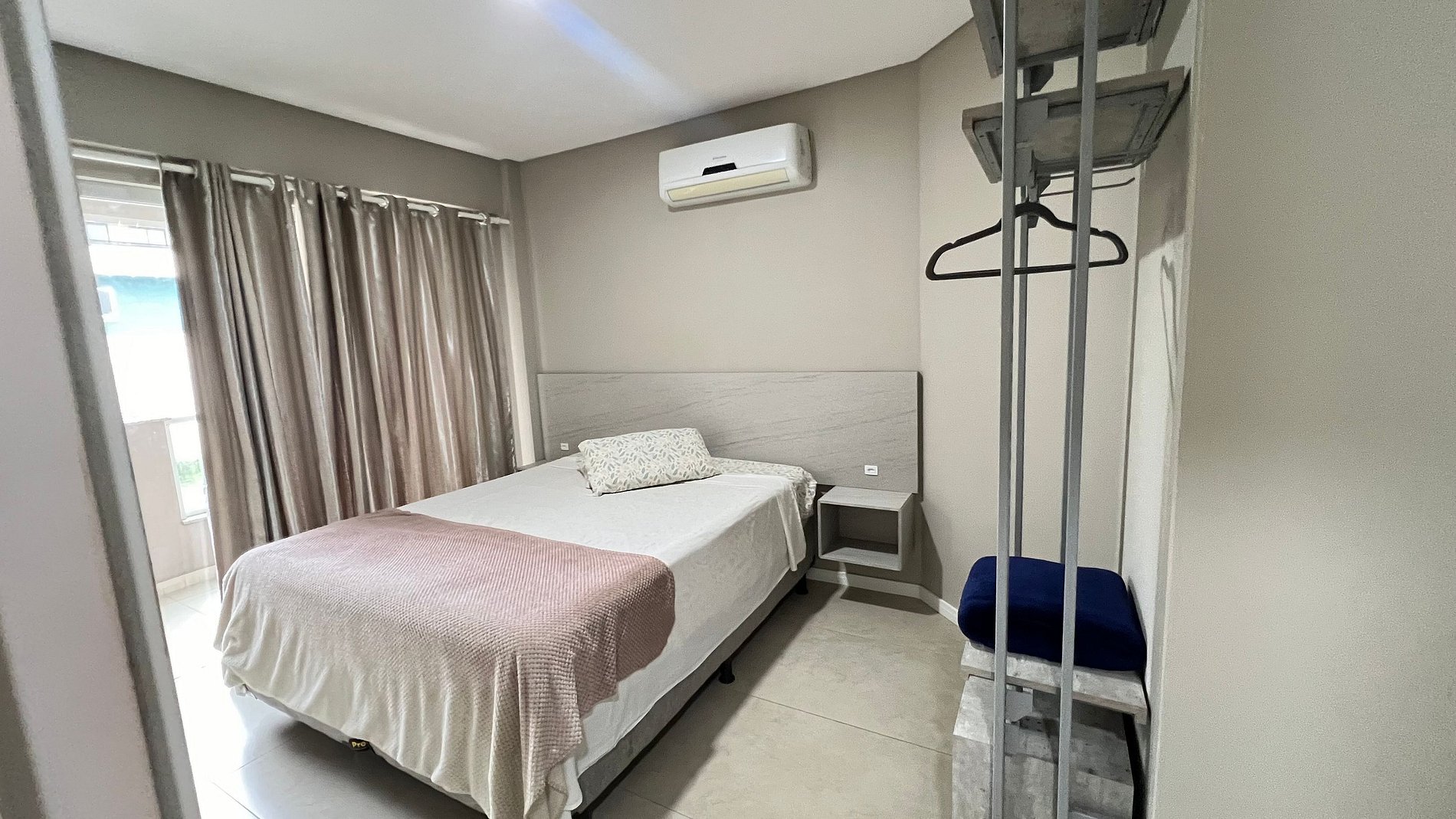 Apartamento ideal para 5 pessoas. A partir da porta para frente temos a sala com um sofá-cama e Smart-TV 42", que é conjugada com a cozinha formando um bom espaço para acomodar a todos, em seguida uma sacada com churrasqueira e lavanderia equipada com máquina de lavar roupas. A partir da porta para o lado direito, possui um corredor para um banheiro, um dormitório com cama de casal e para uma suíte, ambos com ar-condicionado